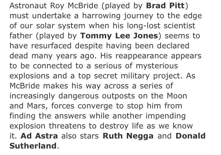 Achter ad astra komt bij mij een kruisje. Trailer gezien, paar kritieken gelezen, en met de wetenschap dat scifi thrillers helemaal mijn ding zijn, zegt mijn gevoel mij op dit moment dat dit best eens 5* kunnen worden. Ja. Hoge verwachtingen, deze ga ik zeer zeker in de bioscoop zien.