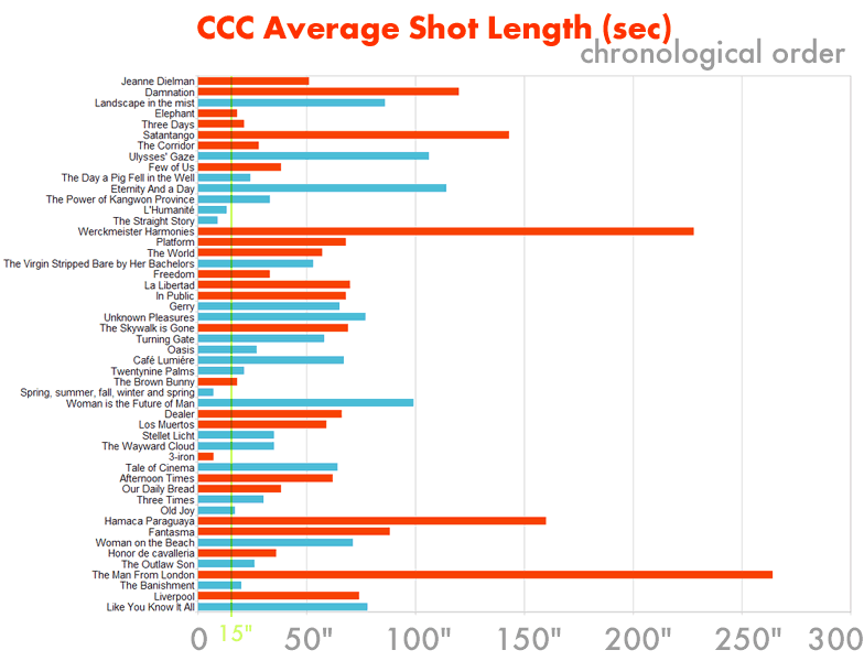Toch duren de shots in deze film gemiddeld langer dan in zijn voorgangers. The Turin Horse gaat hier weer overheen met gemiddeld bijna vijf minuten per shot (als de film inderdaad uit 30 shots bestaat, sommige sites geven namelijk aan dat de ASL maar 229 seconden is, maar dit lijkt mij niet te kloppen).