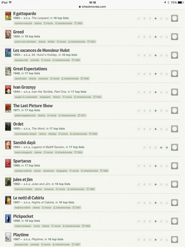Ik zie net dat alle films die ik nog niet gezien heb die op meer dan 15 official lists staan op één iPad scherm passen (normale weergave). Das het goede nieuws. Maar eerlijk gezegd zie ik dat de meeste titels hiervan wel zijn overgebleven omdat ik er een beetje tegenaan hik