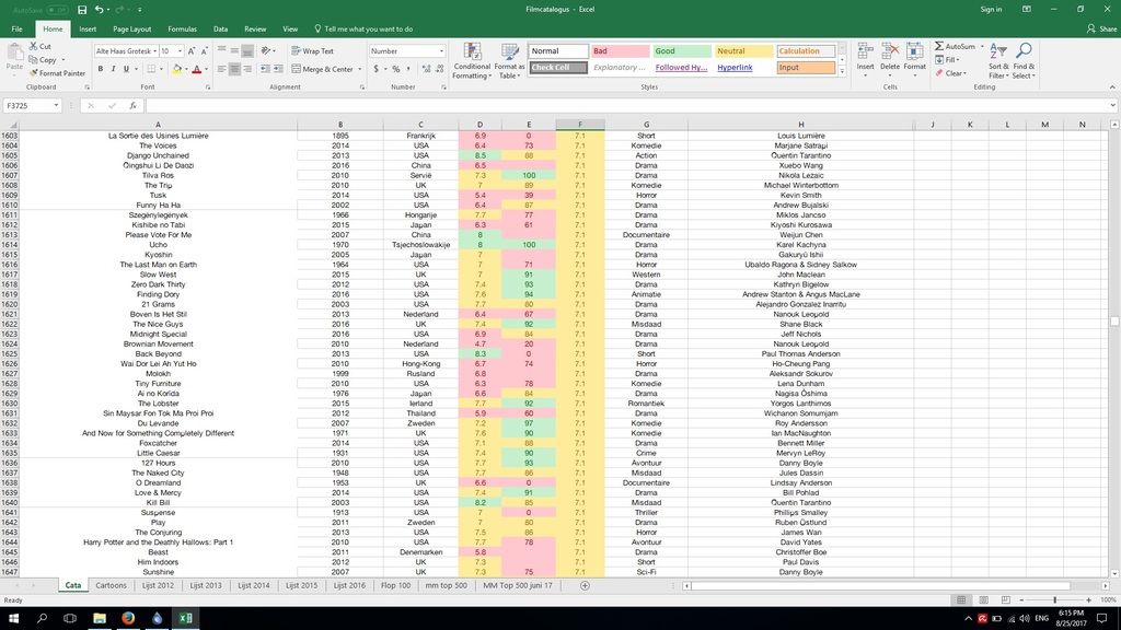 Sinds januari vorig jaar geregistreerd op MM en sindsdien bij elke film die ik sindsdien zag een vrij behoorlijke recensie. Nu één jaar later van plan om alle bekeken films in een mooie excel-sheet (met diverse parameters) te zetten. Intussen zijn we toch al ruim de 400 films overstegen.