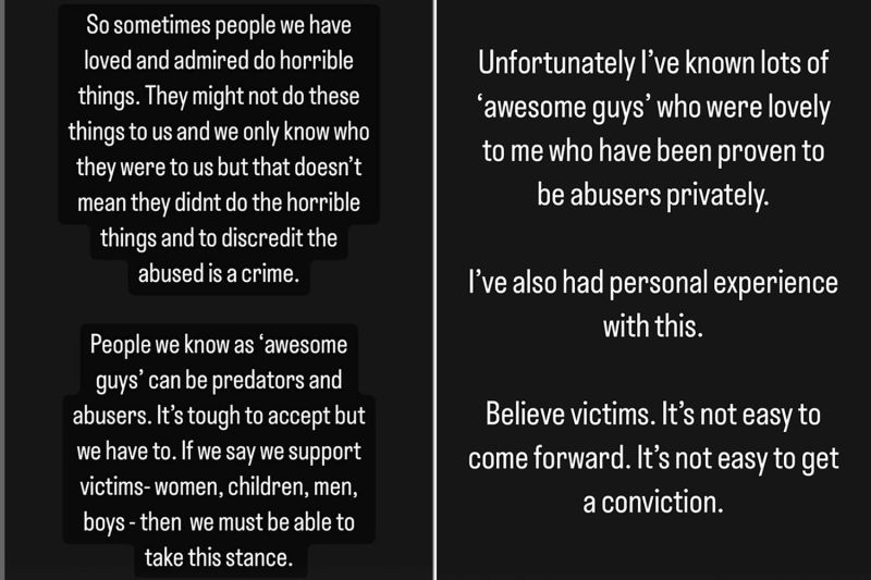 In de tweede slide van haar story merkte de actrice ook op dat ze zelf van die 'geweldige gasten' heeft gekend, die geweldig voor haar waren, maar in privé-omgevingen bleken misbruikers te zijn voor andere mensen. "Ik heb hier ook persoonlijke ervaring mee", concludeerde ze. "Geloof de slachtoffers. Het is niet gemakkelijk om naar voren te komen. Het is niet eenvoudig om tot een veroordeling te komen."
